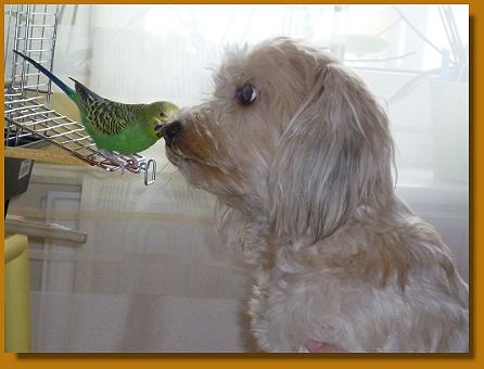 Was von Anfang an gut klappte, war sie im Haus auch mal alleine zu lassen. Mittlerweile hat sie auf vielen Spazier-gängen neue Hundefreunde kennengelernt, wobei sie die größeren Hunderassen (z. B. Labrador) bevorzugt. Wie man auf dem einen Bild sehen kann, versucht sie ihren Freundes-kreis zu vergrößern und hat sich dazu unseren Wellensittich ausgesucht.
