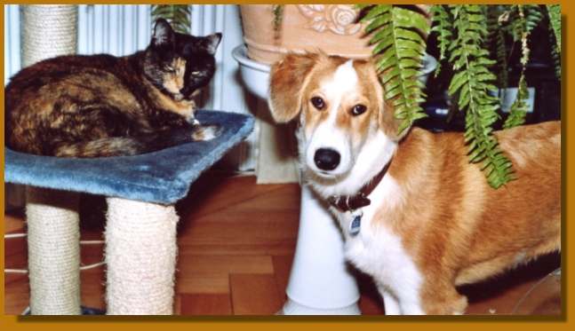Im meinem neuen Zuhause wurde ich auch grad standesgemäss empfangen vom grossen NeufundländerXSchäfer 'Shandor' und vom Spanischen Hirtenhund 'Tibi' - selbstverständlich auch von deren Zweibeinern. Sehr nett. Als ich ins Haus kam, da kam mir doch ein Tier entgegen, das ich noch nie zuvor gesehen habe. So gerne wäre ich hingegangen und hätte geschnüffelt und gespielt. Aber dieses Tier hat gefaucht und ich durfte meine Nase nicht ins Fell graben. Stellt Euch vor: da hat ein Wesen Angst vor mir (hihi).