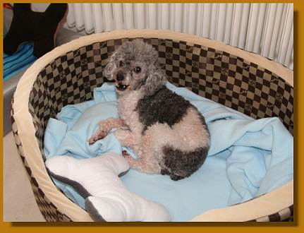 Die Maus ist einfach süß - und fordert auch ihre Streicheleinheiten nachdrücklich ein, wenn sie neben einem auf dem Sofa sitzt, da wird das Näschen dann unter den Arm geschoben und kräftig nach oben gestuppst. Auch ansonsten hat sie sich gut eingelebt: mehrmals täglich wird sich ausgiebig grunzend im Körbchen gewälzt. Danach stellt sie sich dann vor uns und schaut uns schwanzwedelnd ganz groß an - und es sieht fast so aus, als ob sie grinsen würde.