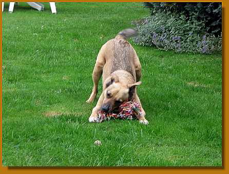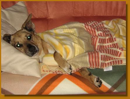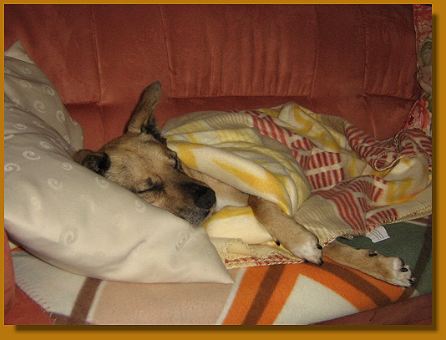 wir schicken Euch heute die ersten Fotos von unserem Robbie. Weitere werden folgen. Robbie hat sich wirklich gut eingelebt. Er hat sich "sein" Sofa sofort ausgesucht, wie Ihr auf den Fotos sehen könnt. Natürlich schläft er nicht immer so "wohlbehütet". Wir hatten ihn eigentlich nur fürs Foto so schön zugedeckt, aber prompt ist er liegengeblieben und eingeschlafen. Robbie ist wirklich ein kleiner Schatz. Kaum zu glauben, dass ihn vorher niemand haben wollte. Wir jedenfalls haben ihn in unser Herz geschlossen. Seine kleine Macke, das markieren in der Woh-nung, ist anscheinend auch erledigt. Auch das Alleinebleiben klappt immer besser. Mit Chrissie und Kira versteht er sich auch richtig gut. Kira und Robbie haben auch schon gemeinsam getobt. Robbie und unser Kater "Wastl", das ist so eine Sache. Lange Zeit ist alles gut, dann muss der Kater mal wieder gescheucht werden. Aber wirklich erschüttern kann es Wastl nicht, ich glaube, er nimmt Robbie auch garnicht so richtig ernst. Angst zeigt er jedenfalls nicht. Diese Übermutsattacken ist er allerdings von Kira auch gewöhnt. Wir haben übrigens für Robbie eine neue Hunderasse erfunden: den "Klettenhund". Tagsüber klebt er nämlich wie eine Klette an mir, er ist wohl ein Männerhund.