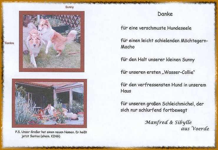 An einem schönen Sommertag bekam Santos Besuch von Ginger, der Siegerin des vorjährigen Wettbewerbs "Der Hund mit der imponierendsten Stimme". Die drei Collies hatten eine Menge Spaß mit Bällchen spielen, Wettlaufen und Wett"reden"!